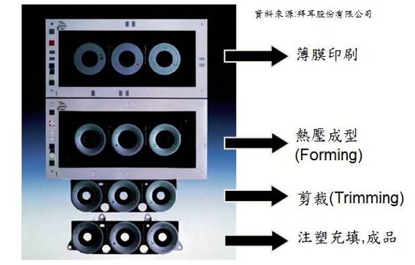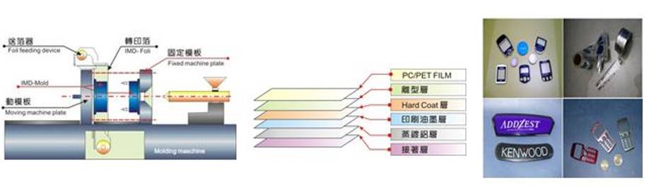 將印刷完成的薄膜利用不同型式置入模具,經(jīng)射出成型后,得到具有印刷質(zhì)感之成型,結(jié)合產(chǎn)品設(shè)計、模具技術(shù)部與傳統(tǒng)后加工技術(shù)為一體的制程技術(shù)。主要應(yīng)用材料包含片材、樹脂、油墨三部分。
