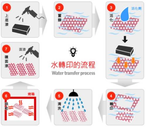 水轉(zhuǎn)印是種通過水的作用,將平面印刷的圖文轉(zhuǎn)印至不同材質(zhì)物體表面的技術(shù)。水轉(zhuǎn)印又分為水標(biāo)轉(zhuǎn)印與水披覆轉(zhuǎn)印(曲面披覆)兩種,水標(biāo)轉(zhuǎn)印主要用于文字與寫真圖案的轉(zhuǎn)印,水披覆轉(zhuǎn)印則主要用于在整個物體表面進行完整的轉(zhuǎn)印。